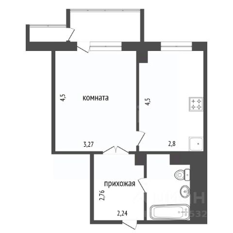 Квартира правильной геометрической формы, зонирована на комнату и кухню
