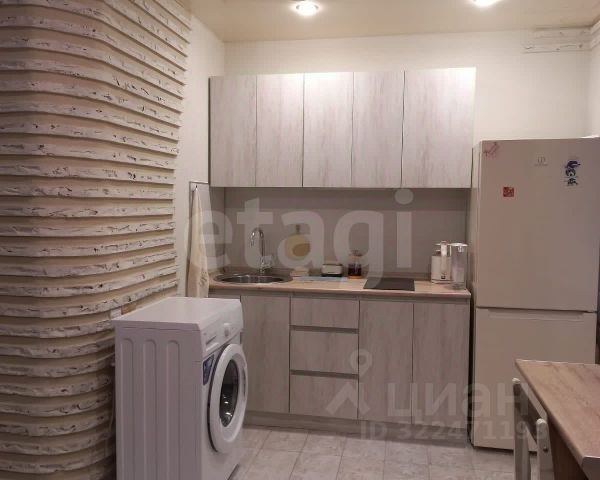 Далее в квартире есть небольшая кухня (без окна, но с большой зоной готовки, раковиной, холодильником, плитой, духовым шкафом, микроволновкой и дополнительной подсветкой зоны готовки). В кухне много ящиков для удобного хранения и приготовления пищи.