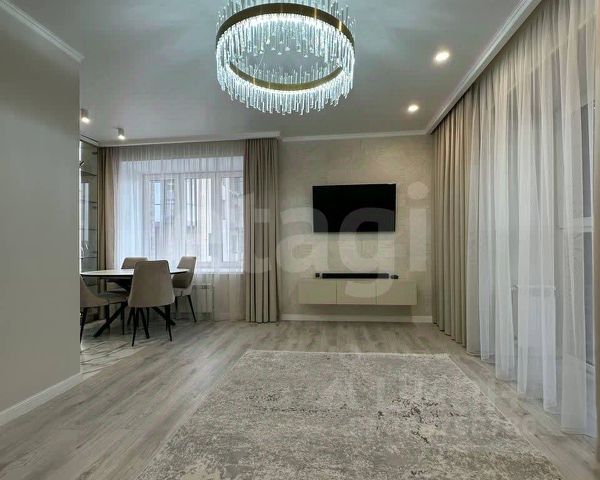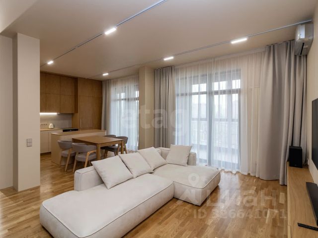 Кухня-гостиная с панорамными окнами (вид на парк 400т-летия, закаты, МВДЦ Сибирь, Взлетку), мини-гостиная с ТВ зоной и полноценным диваном. Отдельно-стоящий остров (в него встроены ПММ, СМА, системы хранения, каменная столешница). Кухонный гарнитур укомплектован всей необходимой техникой. Есть кондиционер.