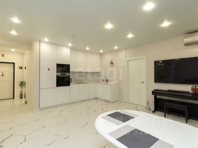 Кухня-гостиная с панорамными окнами (вид на парк 400т-летия, закаты, МВДЦ Сибирь, Взлетку), мини-гостиная с ТВ зоной и полноценным диваном. Отдельно-стоящий остров (в него встроены ПММ, СМА, системы хранения, каменная столешница). Кухонный гарнитур укомплектован всей необходимой техникой. Есть кондиционер.
