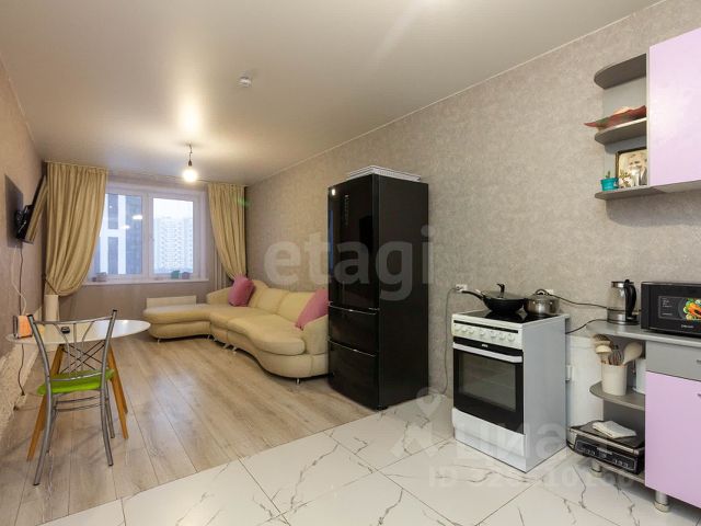 Кухня-гостиная с панорамными окнами (вид на парк 400т-летия, закаты, МВДЦ Сибирь, Взлетку), мини-гостиная с ТВ зоной и полноценным диваном. Отдельно-стоящий остров (в него встроены ПММ, СМА, системы хранения, каменная столешница). Кухонный гарнитур укомплектован всей необходимой техникой. Есть кондиционер.