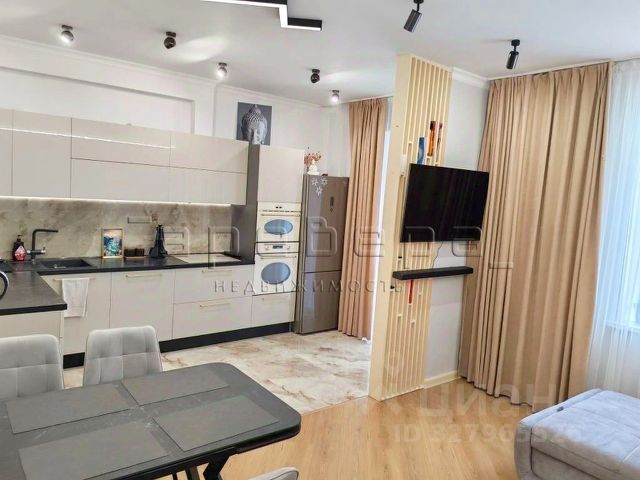 Кухня-гостиная с панорамными окнами (вид на парк 400т-летия, закаты, МВДЦ Сибирь, Взлетку), мини-гостиная с ТВ зоной и полноценным диваном. Отдельно-стоящий остров (в него встроены ПММ, СМА, системы хранения, каменная столешница). Кухонный гарнитур укомплектован всей необходимой техникой. Есть кондиционер.