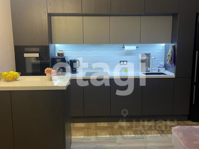 Далее в квартире есть небольшая кухня (без окна, но с большой зоной готовки, раковиной, холодильником, плитой, духовым шкафом, микроволновкой и дополнительной подсветкой зоны готовки). В кухне много ящиков для удобного хранения и приготовления пищи.
