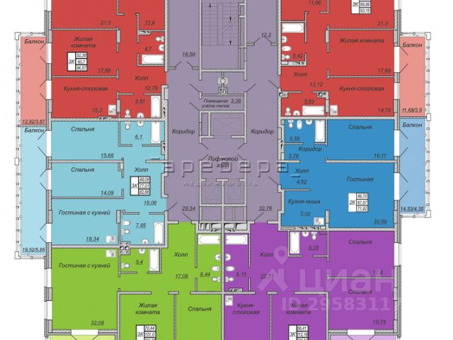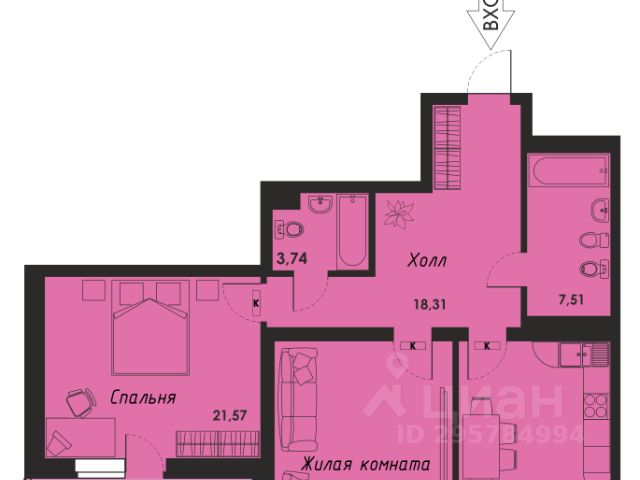 Квартира включает две спальни, кухню-гостиную, 2 санузла (ванная и душевая комнаты), балкон и большая лоджия. На полу австрийская ПВХ-плитка.