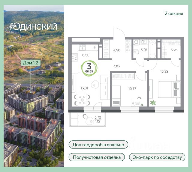 3-комнатная квартира, 73.39кв.м., 6 этаж Новый микрорайон комфорт-класса в западной части Ветлужанки в Красноярске. В шаговой доступности уже строится гольф-поле и эко-парк Юдинская долина - новое место притяжения красноярцев. В ЖК предусмотрены кирпичные дома переменной этажности. Первый дом комплекса состоит из 5 секций с этажностью в 6-8 этажей. Квартирография предусматривает 1-4-комнатные квартиры площадью от 37 до 102 м². id#19787