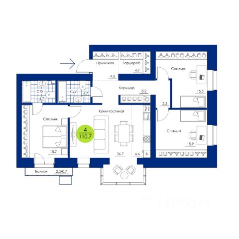 Продаётся 4-комнатная квартира в сданном доме (Дом 2, 3 этап), срок сдачи: IV-кв. 2024, общей площадью 93.19 кв.м., на 6 этаже. Расположение, транспортная доступность