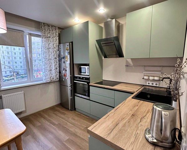 - Полная комплектация кухни: индукционная варочная поверхность, микроволновая печь, духовой шкаф на две секции, каменная столешница с интегрированной раковиной, система фильтрации воды, диспоузер, отдельные секции для сортировки мусора, двухдверный Side-by-Side холодильник с подачей охлаждённой воды и лёдогенератором, функция ударной заморозки.