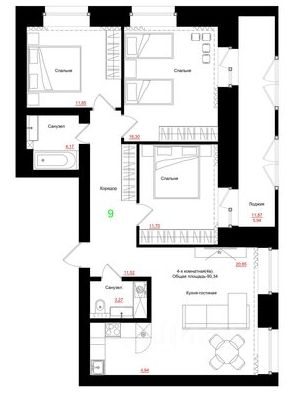 Привлекательная геометрика - квартира на две стороны, большая кухня- гостиная с двумя окнами, три раздельные спальни, две из которых с лоджией, а третья- с двумя окнами, которую можно поделить на две комнаты, три раздельных санузла.