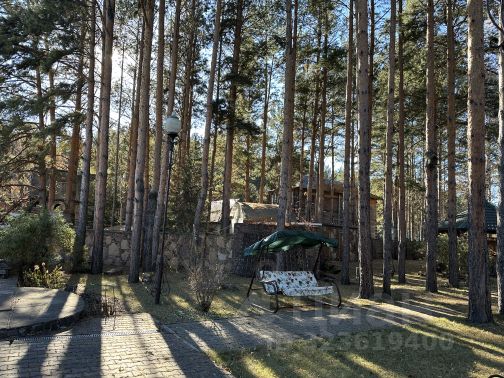Половина участка — в сосновом лесу, вторая половина вымощена тротуарной плиткой.