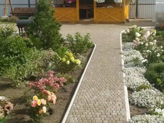 Половина участка — в сосновом лесу, вторая половина вымощена тротуарной плиткой.