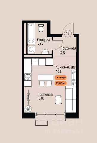 Продаётся 1-комнатная квартира в строящемся доме (Дом 12), срок сдачи: IV-кв. 2027, общей площадью 25.43 кв.м., на 2 этаже. Расположение, транспортная доступность