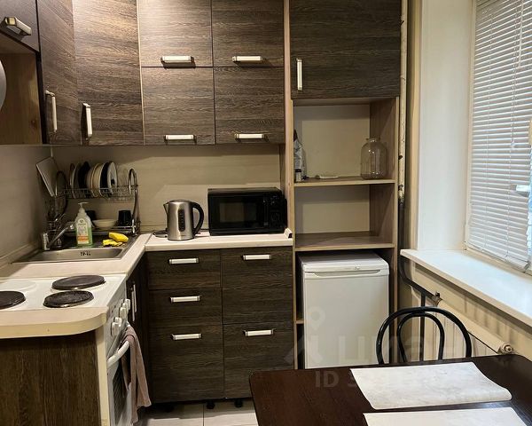 Далее в квартире есть небольшая кухня (без окна, но с большой зоной готовки, раковиной, холодильником, плитой, духовым шкафом, микроволновкой и дополнительной подсветкой зоны готовки). В кухне много ящиков для удобного хранения и приготовления пищи.