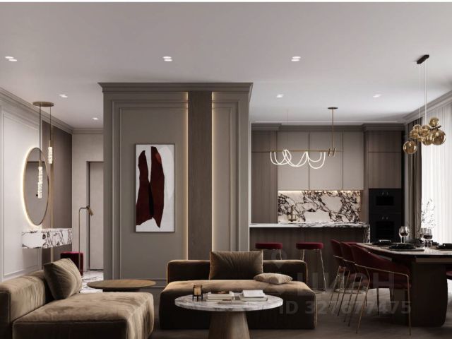 Кухня-гостиная с панорамными окнами (вид на парк 400т-летия, закаты, МВДЦ Сибирь, Взлетку), мини-гостиная с ТВ зоной и полноценным диваном. Отдельно-стоящий остров (в него встроены ПММ, СМА, системы хранения, каменная столешница). Кухонный гарнитур укомплектован всей необходимой техникой. Есть кондиционер.