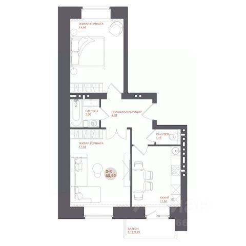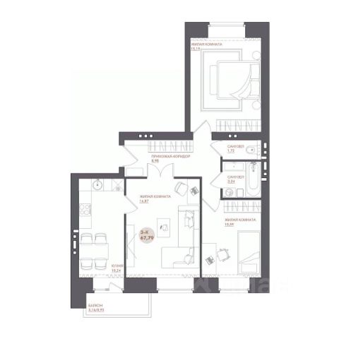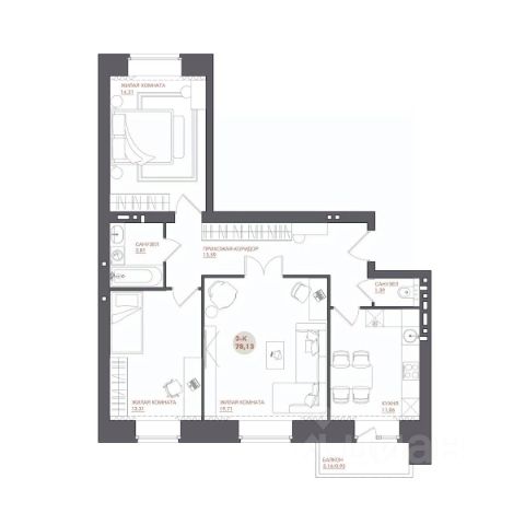 В коридоре два встроенных шкафа-купе с зеркальными дверями, стены отделаны текстурной штукатуркой, натяжные потолки.
