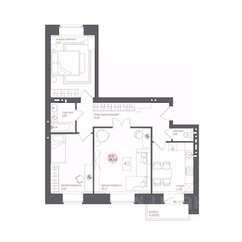 Привлекательная геометрика - квартира на две стороны, большая кухня- гостиная с двумя окнами, три раздельные спальни, две из которых с лоджией, а третья- с двумя окнами, которую можно поделить на две комнаты, три раздельных санузла.