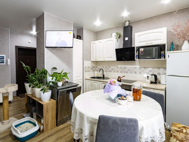 Кухня-гостиная с панорамными окнами (вид на парк 400т-летия, закаты, МВДЦ Сибирь, Взлетку), мини-гостиная с ТВ зоной и полноценным диваном. Отдельно-стоящий остров (в него встроены ПММ, СМА, системы хранения, каменная столешница). Кухонный гарнитур укомплектован всей необходимой техникой. Есть кондиционер.