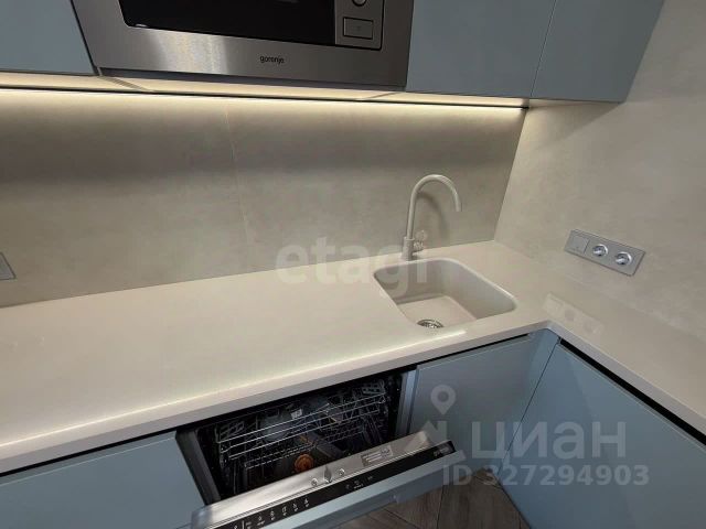 • На просторной кухне 9 м2 установлен современный кухонный гарнитур изготовленный под заказ. Бытовая техника встроенная, квадратная удобная мойка.