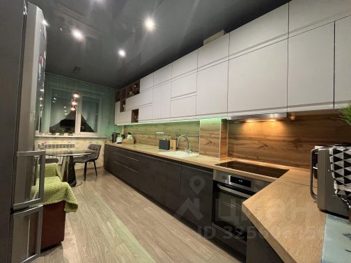 Потолки в зале и спальне натяжные; в коридоре, кухне и ванной гипсорартон со встроиными светильниками. На полу уложены плиты ОSB сверху линолиум.
