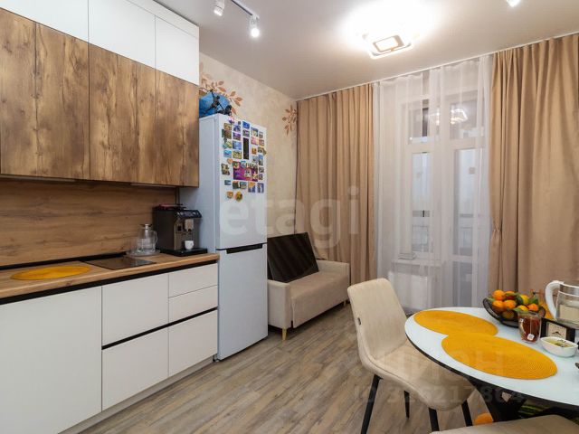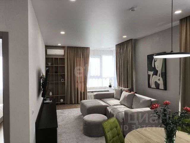 Кухня-гостиная с панорамными окнами (вид на парк 400т-летия, закаты, МВДЦ Сибирь, Взлетку), мини-гостиная с ТВ зоной и полноценным диваном. Отдельно-стоящий остров (в него встроены ПММ, СМА, системы хранения, каменная столешница). Кухонный гарнитур укомплектован всей необходимой техникой. Есть кондиционер.