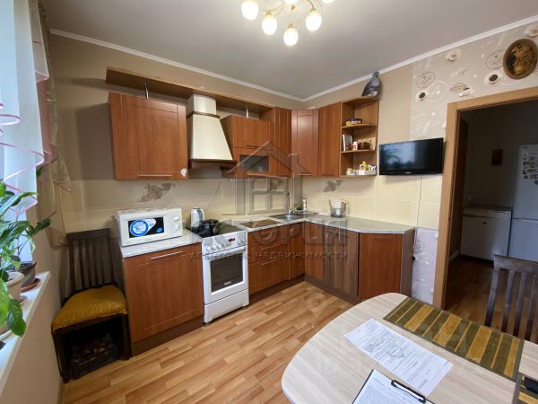 Кухня 9кв.м., цветы на стенах которой будут всегда создавать хозяйке хорошее настроение. Современный кухонный гарнитур имеет доводчики, что вносит комфорт в быт хозяйки. Имеется встроенная техника: варочная панель, духовка, посудомоечная машина, холодильник и стиральная машина.