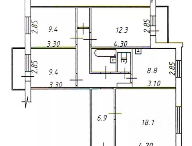 Высокие потолки 2.9м.