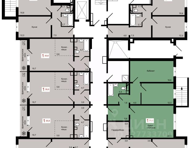 Продаётся 1-комнатная квартира в строящемся доме (Дом 4.4), срок сдачи: IV-кв. 2027, общей площадью 71.1 кв.м., на 1 этаже. Новые жилые дома от застройщика "Культбытстрой" расположены по ул. Кутузова в жилом районе "Мичуринский" в Кировском районе Красноярска.