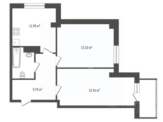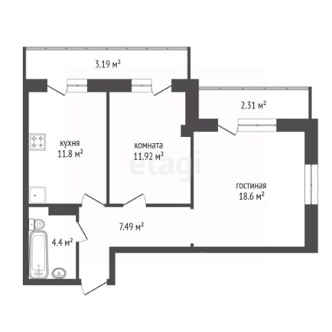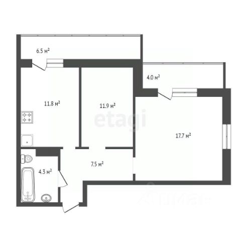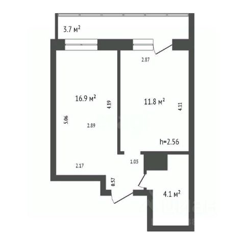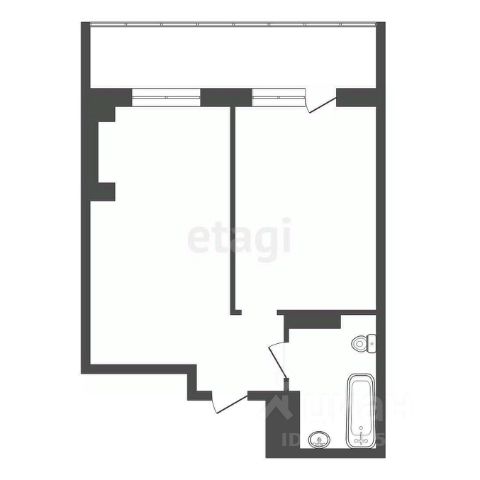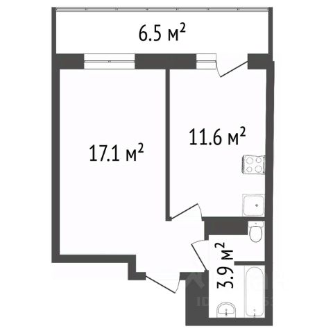 Планировка: прихожая, гардеробная, комната, совмещенная с кухонной зоной и выходом на остекленный балкон, большой совмещенный санузел.