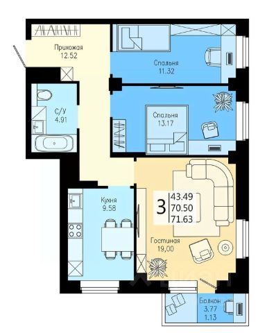 Продаётся 3-комнатная квартира в строящемся доме (Дом 5), срок сдачи: III-кв. 2026, общей площадью 71.63 кв.м., на 8 этаже. Расположение, транспортная доступность Жилой комплекс "На Дудинской" включает в себя пять односекционных 25-этажных зданий класса "комфорт", которые объединены между собой общей стилобатной частью. Новостройка расположена в Советском районе, в микрорайоне Стрелка, на месте бывших промзон, на улице Дудинская, поблизости с улицами Аэровокзальная, Партизана Железняка и Шахтеров, на расстоянии примерно одного километра от автовокзала Красноярск. До исторического центра города от улицы Дудинская менее 5 километров, недалеко находится торгово-деловой центр города - микрорайон Взлетка. Инфраструктура Собственная инфраструктура комплекса включает в себя продуктовый супермаркет, мебельный салон, разнообразные магазины, фитнес-центры, кафе, кинозал, офисы и другие объекты, расположенные в стилобатной части. Рядом с комплексом работают: детские сады 3, 99, 79, частные детские сады "Бибигон", "Забота", школы 70, 66, 27, 14, Медицинская академия, Художественный институт, Академия музыки и театра, больница им. Макарова, Краевая клиническая больница, Клиника общей врачебной практики, НИИ Медицинских проблем Севера, торгово-развлекательные центры "Комсомолл", "Июнь", "Планета", "Покровsky", многофункциональный торговый центр "Зеленый" с гипермаркетом "Ашан", торговые центры "Аэро", "Сибирский городок", "Взлетка Плаза", Dommer, "Авиатор", торгово-офисный комплекс "Арбат", гипермаркеты "Лента", "Декатлон", "Леруа Мерлен", "Окей", рынок "Новая Взлетка", ледовый дворец "Кристалл", ипподром, бассейн "Медуза", многофункциональный спортивный комплекс "Арена Север" с ледовой ареной и конференц-залами, музей "Мемориал Победы", 30-этажный деловой центр "Первая башня", бизнес-центры, международный выставочно-деловой центр "Сибирь". Недалеко от новостройки находится центр здорового образа жизни и семейного активного отдыха - остров Татышев, где представлена оздоровительная инфраструктура, есть яблоневая роща из 13 тыс. деревьев. На острове проходят разнообразные фестивали и музыкальные концерты. Экологическая обстановка в районе оценивается как удовлетворительная. Рядом с комплексом протекает река Енисей, находятся несколько скверов, парки 400-летия Красноярска и "Сады мечты". Надежность застройщика Жилой комплекс "На Дудинской" построила созданная в 2001 году красноярская группа компаний "Ментал-Плюс". Специализация предприятия - возведение и реконструкция жилых, торговых, административных и промышленных объектов в Красноярске и Красноярском крае. На счету ГК "Ментал-Плюс" десятки реализованных проектов - жилые дома на улицах Калинина, Березина, Ключевской, 26 Бакинских комиссаров, апарт-отель "Парк-Сити", торгово-офисные комплексы "Айсберг", "Махаон", "Кристалл", бизнес-центр "Капитал" и другие объекты. Над архитектурной концепцией жилого комплекса "На Дудинской" трудилось проектное бюро "Вертикаль". Все строительно-монтажные раб