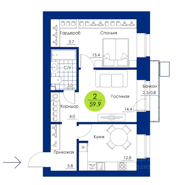 Продаётся 2-комнатная квартира в строящемся доме (1 этап), срок сдачи: IV-кв. 2027, общей площадью 57.9 кв.м., на 6 этаже. Новый жилой комплекс "Вита парк" от застройщика "ГСК Арбан" расположен по адресу: г. Красноярск, улица Елены Стасовой.
