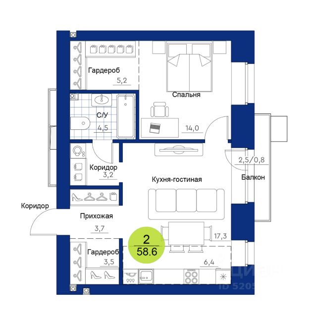 Продаётся 2-комнатная квартира в строящемся доме (2 этап), срок сдачи: IV-кв. 2029, общей площадью 58.6 кв.м., на 5 этаже. Новый жилой комплекс "Вита парк" от застройщика "ГСК Арбан" расположен по адресу: г. Красноярск, улица Елены Стасовой.
