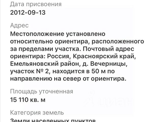 Код объекта: 1532760. Уникальное предложение для тех, кто мечтает о собственном уголке вдали от городской суеты! Земельный участок в деревне Вечерницы, Емельяновский район, Красноярский край — идеальное место для строительства вашего будущего дома. Статус участка — индивидуальное жилищное строительство, площадь — 150 соток. Это место предлагает вам свободу для реализации самых смелых идей в строительстве и ландшафтном дизайне. Подъезд к участку осуществляется по грунтовой дороге, а расстояние до города составляет всего 50 километров — достаточно близко, чтобы сохранять связь с городской жизнью, но достаточно далеко, чтобы наслаждаться спокойствием и природой. Этот участок станет отличным выбором для тех, кто хочет построить дом в экологически чистом районе, где можно дышать свежим воздухом и наслаждаться тишиной. Не упустите возможность стать владельцем этого уникального участка и начать строить свою мечту! Позвоните нам прямо сейчас, чтобы узнать больше и записаться на просмотр. Мы гарантируем безопасную сделку и юридическую поддержку нашим клиентам.