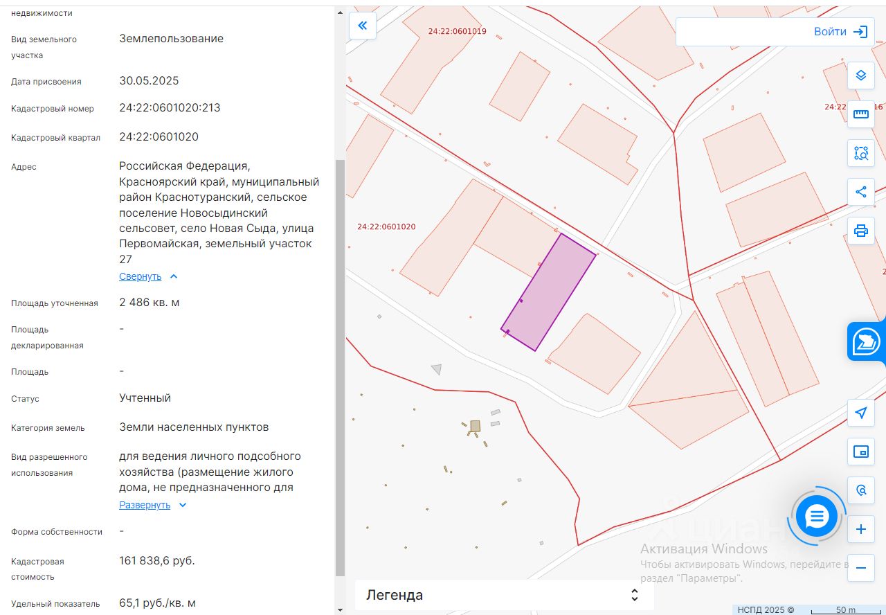Земельный участок из категории земель земли населенных пунктов, с кадастровым номером 24:22:0601020:213, общей площадью 2486 кв.м., по адресу(местоположение): Российская Федерация, Красноярский край, муниципальный район Краснотуранский, сельское поселение Новосыдинский сельсовет, село Новая Сыда, улица Первомайская, земельный участок 27, с разрешенным использованием для ведения личного подсобного хозяйства (размещение жилого дома, не предназначенного для раздела на квартиры (дома, пригодные для постоянного проживания и высотой не выше трех надземных этажей), производство сельскохозяйственной продукции, размещение гаража и иных вспомогательных сооружений, содержание сельскохозяйственных животных), сроком на 20 лет. Начальная стоимость права аренды земельного участка составляет 3630,00 (Три тысячи шестьсот тридцать) рублей 00 коп., в год.