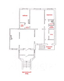 В помещении два входа, центральный и служебный. Витражное остекление входной группы.