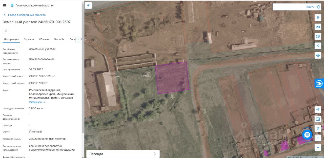 Лот 1. Лот 1. Земельный участок, находящийся в государственной собственности, с кадастровым номером 24:25:1701001:2697, площадью 1800 кв. м, расположенный по адресу: Российская Федерация, Красноярский край, Минусинский муниципальный район, сельское поселение Тесинский сельсовет, с. Большая Иня, ул. Ленина, участок 5А. Категория земель - земли населенных пунктов. Вид разрешенного использования - хранение и переработка сельскохозяйственной продукции. Срок аренды - 5 лет.