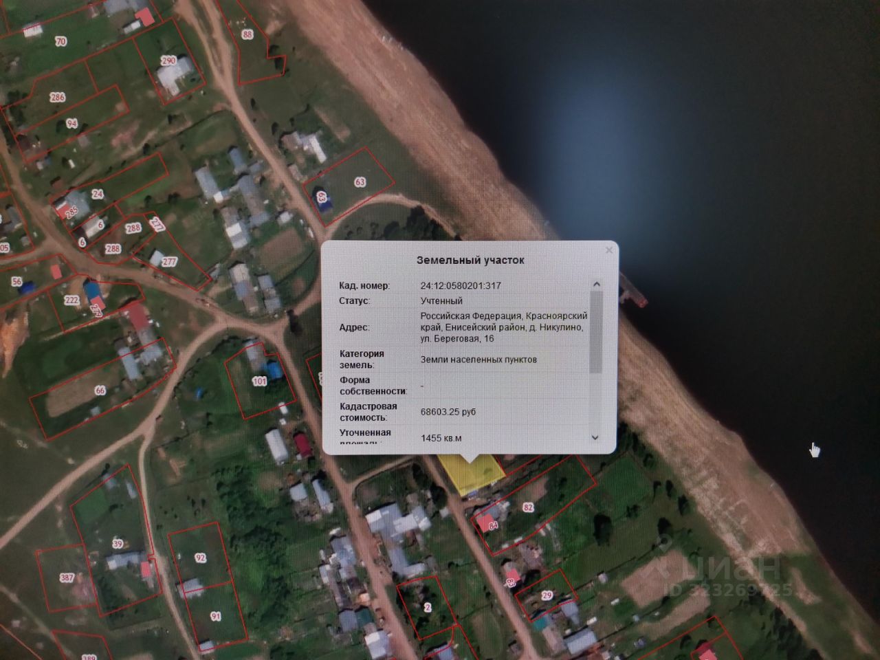 Земельный участок, расположенный по адресу: Российская Федерация, Красноярский край, Енисейский район, д. Никулино, ул. Береговая, д. 16, общей площадью 1455 кв.м., кадастровый номер 24:12:0580201:317, категория земель: "Земли населенных пунктов", разрешенное использование: индивидуальное жилищное строительство (код 2.1).