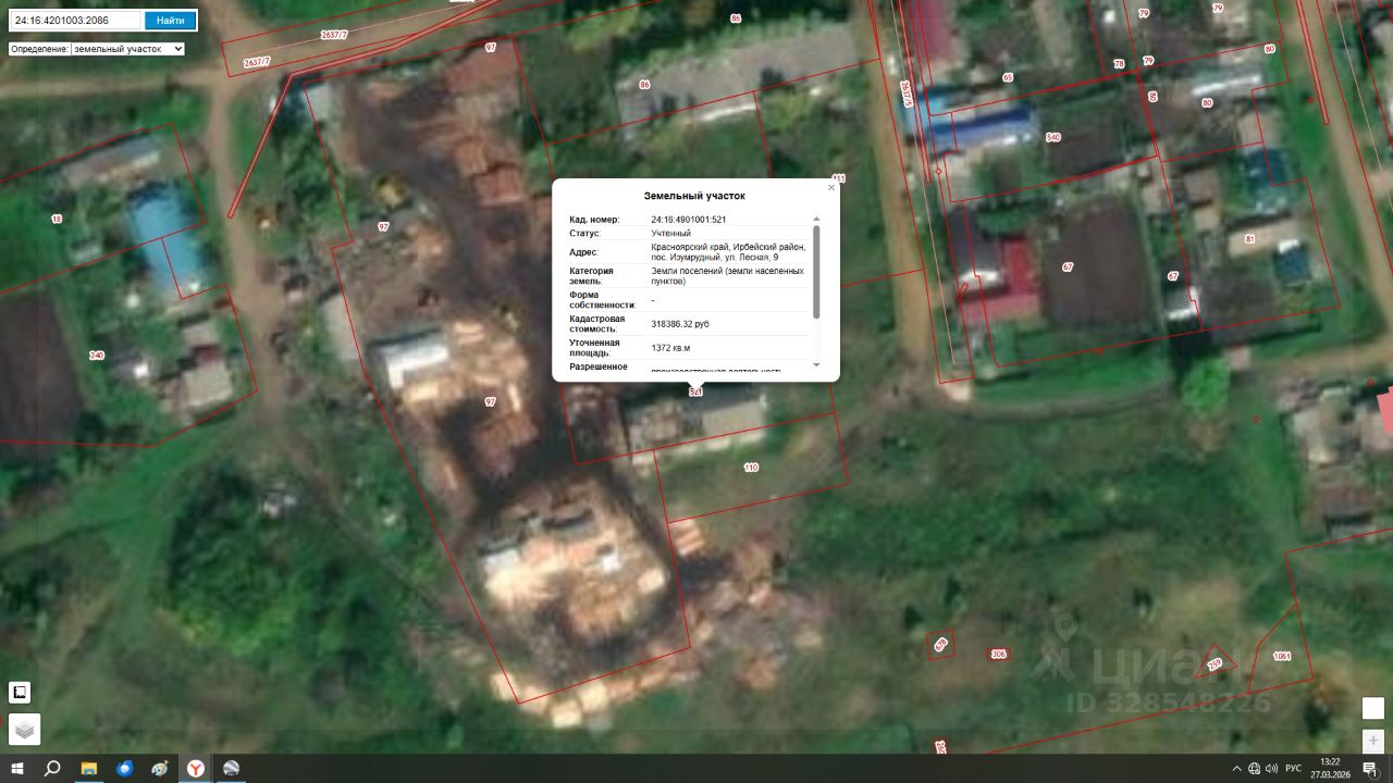 земельный участок с кадастровым номером 24:16:4901001:521, общей площадью 1372 кв.м., категория земель земли населенных пунктов, с видом разрешенного использования производственная деятельность, местоположение: Красноярский край, Ирбейский район, п. Изумрудный, ул. Лесная, 9.