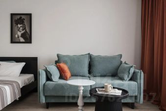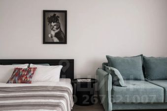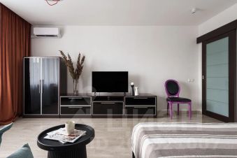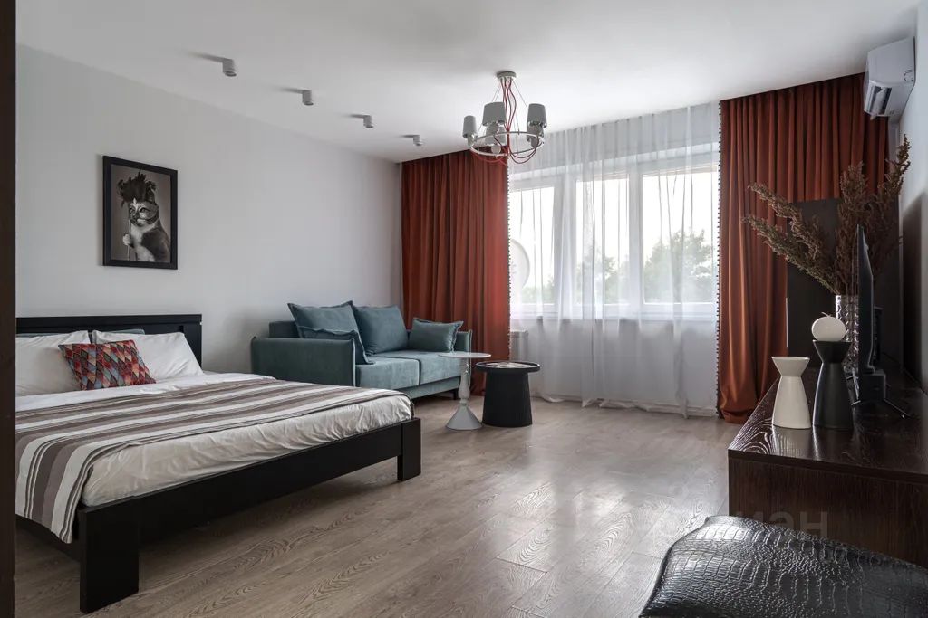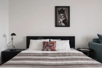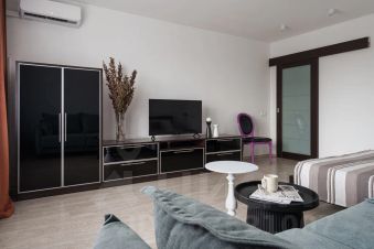 Есть отдельная комната с большой кроватью, изолированная кухня с барной стойкой, своя гардеробная, душевая кабина.