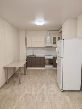 Кухня-гостиная просторная и светлая. Есть, где развернуться. Имеется стол, холодильник и электроплита с духовкой.