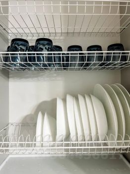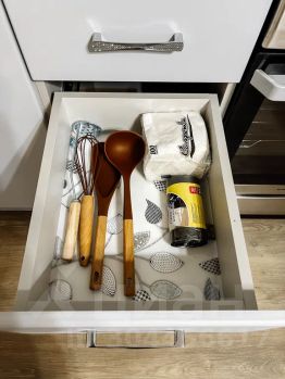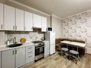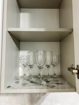 Кухня укомплектована всей необходимой посудой и приборами на 4-е персоны. Новая техника: чайник, холодильник, микроволновая печь, электрическая плита. Приветственный набор продуктов: чай, кофе, сахар, соль, растительное масло, макароны.