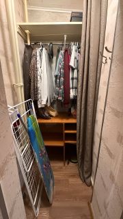 Имеется кладовка - в которой можно разложить вещи, любую обувь. Набор вешалок прилагается. От комнаты отделяется удобными шторками. Организовать систему хранение сможете самостоятельно.