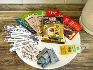 — продукты в индивидуальных упаковках: чай, кофе, сахар, соль, перец, растительное масло.