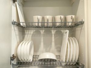 — кухня со всей встроенной бытовой техникой (чайник, холодильник, микроволновая печь, электроплита, духовой шкаф, посудомоечная машина);