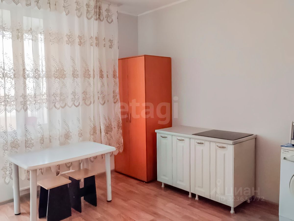 Комната: кухонный гарнитур, холодильник, электрическая сенсорная плита, стол и стулья, шкаф, раскладной диван;