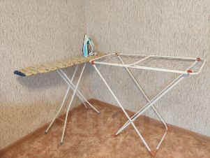 Желая площадь составляет 21кв и включает в себя: диван, ТВ горка, телевизор не смарт ТВ, гладильная доска с утюгом, сушилка для белья напольная, компьютерные стол, wi-fi роутер.