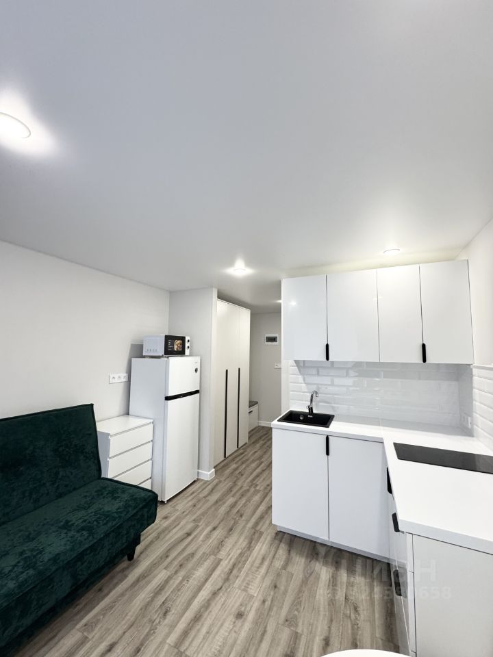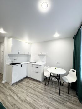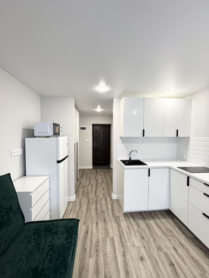 Кухонный гарнитур, встроенная варочная панель (2-комфорочная), холодильник, микроволновая печь.