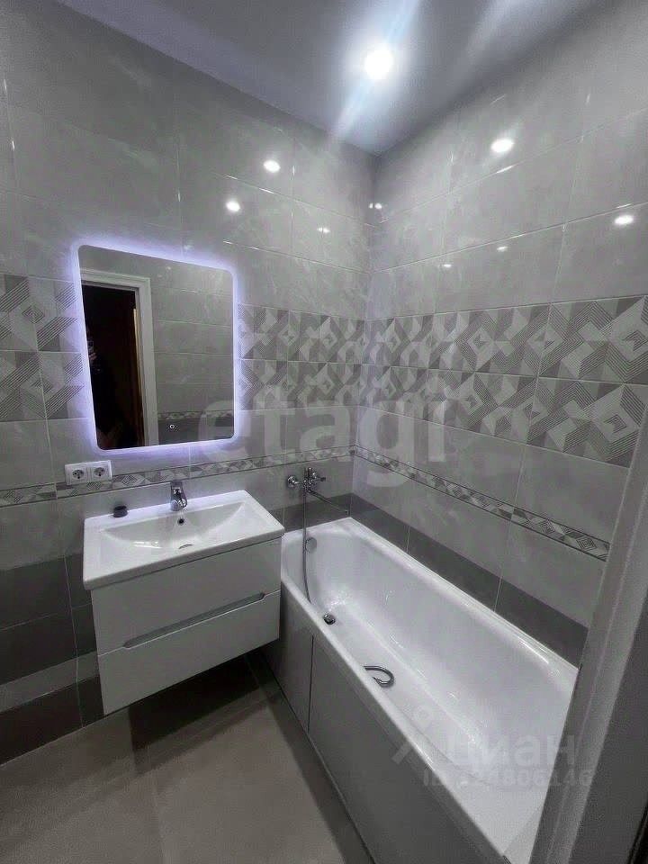 Полноценная ванная, зеркало с подсветкой, под ним розетки для электроприборов, кафель, стиральная машинка, со временем установится водонагреватель. На кухне S=10.6 кв.м): кухонный гарнитур с вытяжкой, плитой и духовкой, есть холодильник. В спальной комнате(S=18.8 кв.м): большая кровать, диван, хранение для вещей.