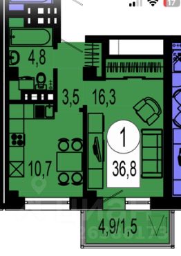 1 комн, 36 кв.м (не студия)