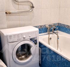 Кухня компактная, холодильник плита. Санузел совмещенный, оформлен плиткой, оснащен ванной и стиральной машиной.