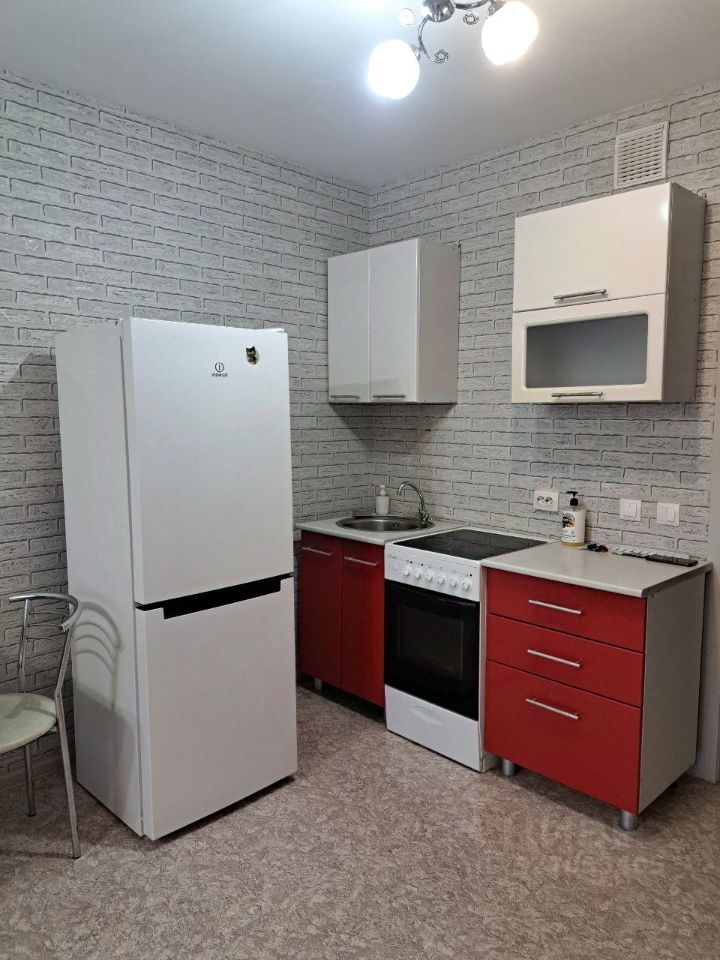 Квартира полностью меблирована и готова к проживанию. На кухне есть всё необходимое для комфортного приготовления пищи, включая холодильник. В комнате удобная мебель, а также есть стиральная машина. Планировка студии продумана для рационального использования пространства, а совмещённый санузел оборудован всем нужным.