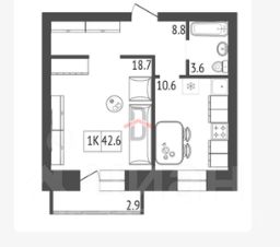 Площадь: Общая 42,6 кв. м, жилая 18,7 кв. м, кухня 10,6 кв. м.